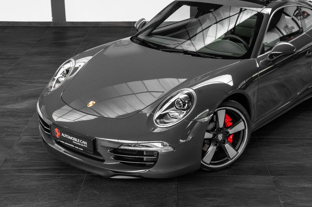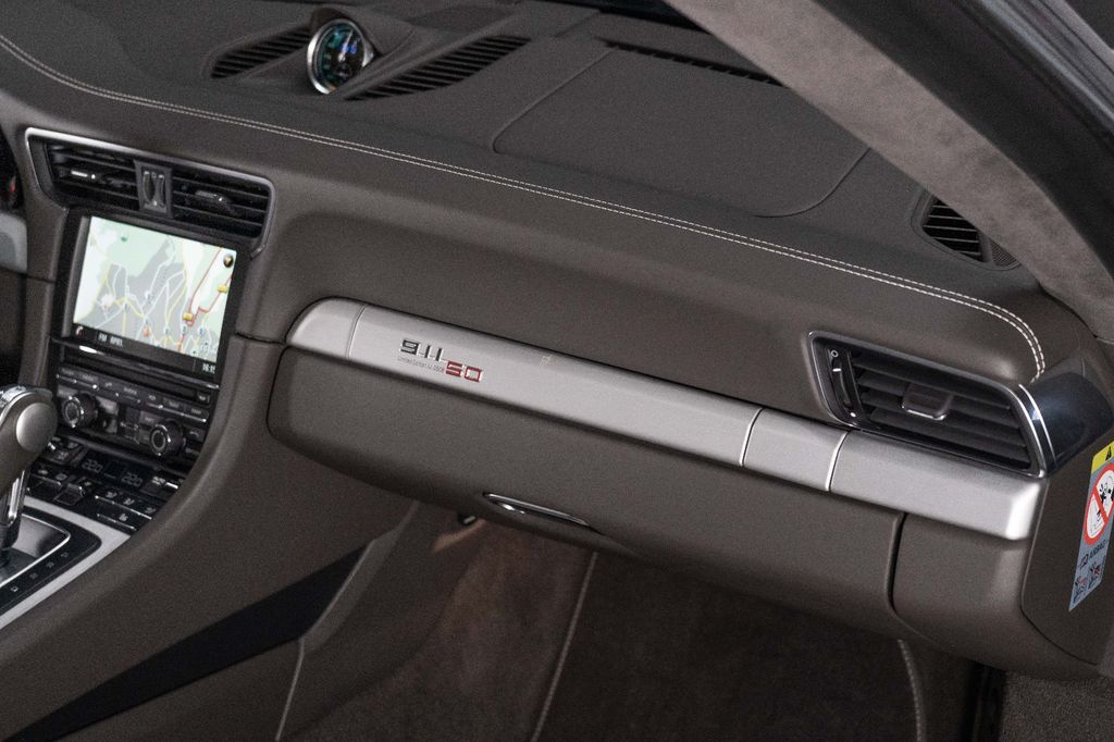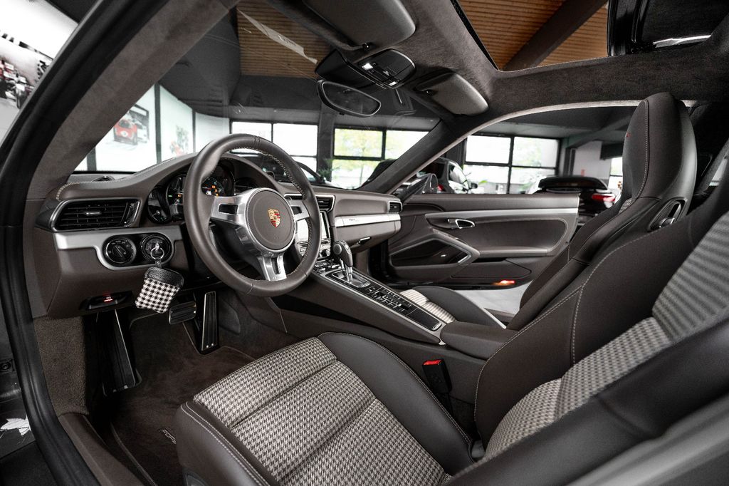 Innen: Leder-/Stoff Kombination mit klassischen "Pepita" Akzenten in achatgrau Stoff/Leder-Kombination mit "911 50" Einprägung an den Kopflehnen und heller Kontrastnaht; Lederbezogenes Cockpit-Armaturentafel und Türbrüstungen; Dachhimmel in Alcantara