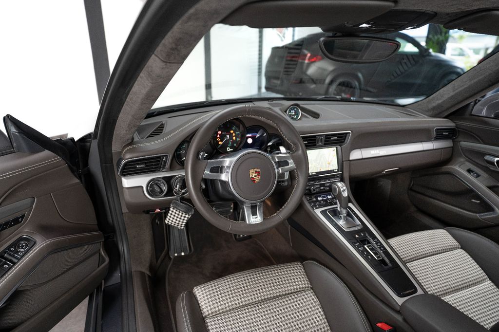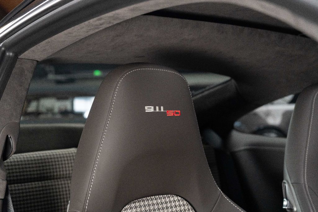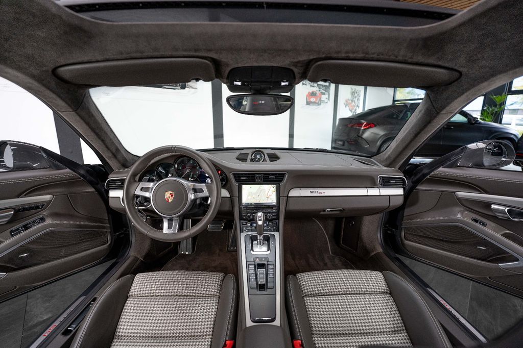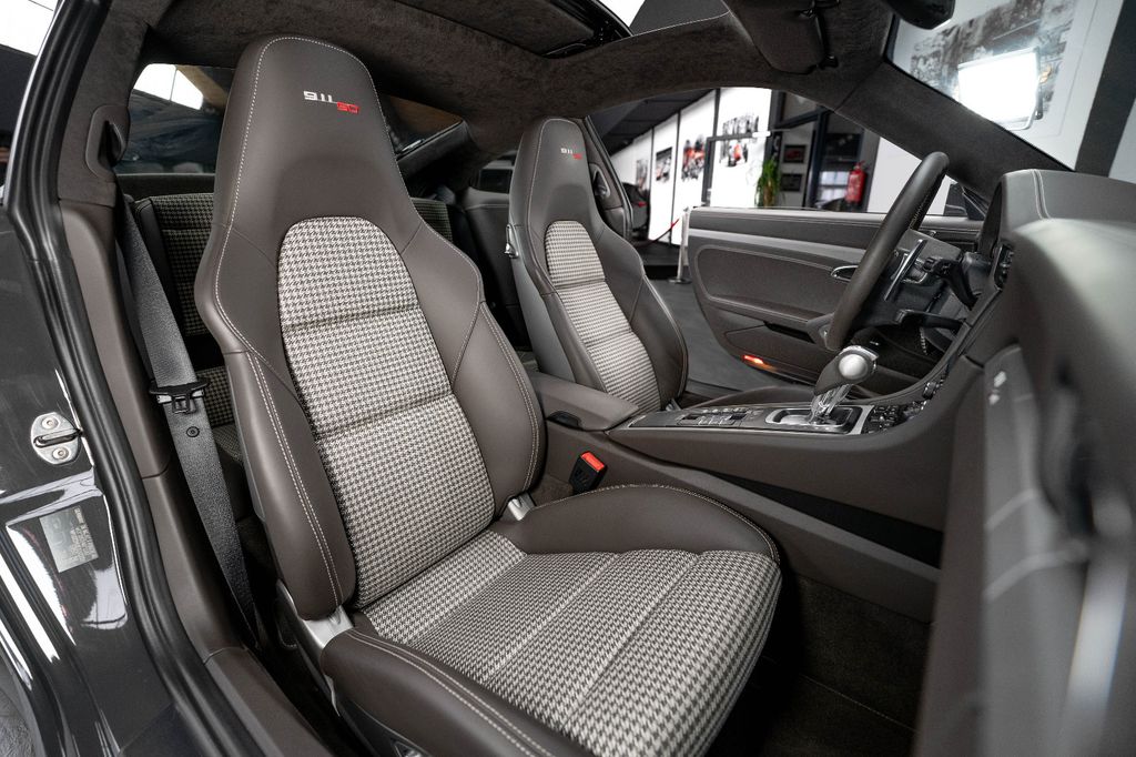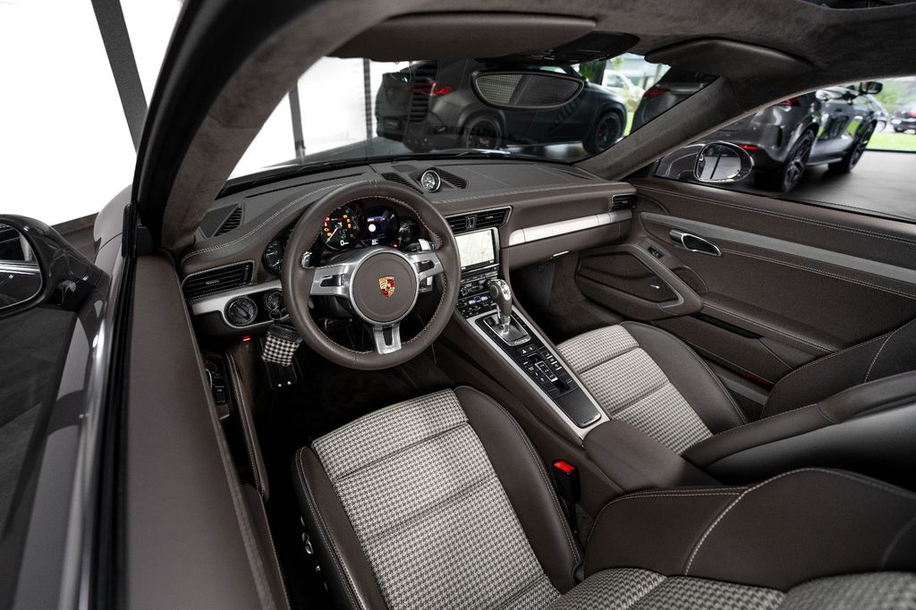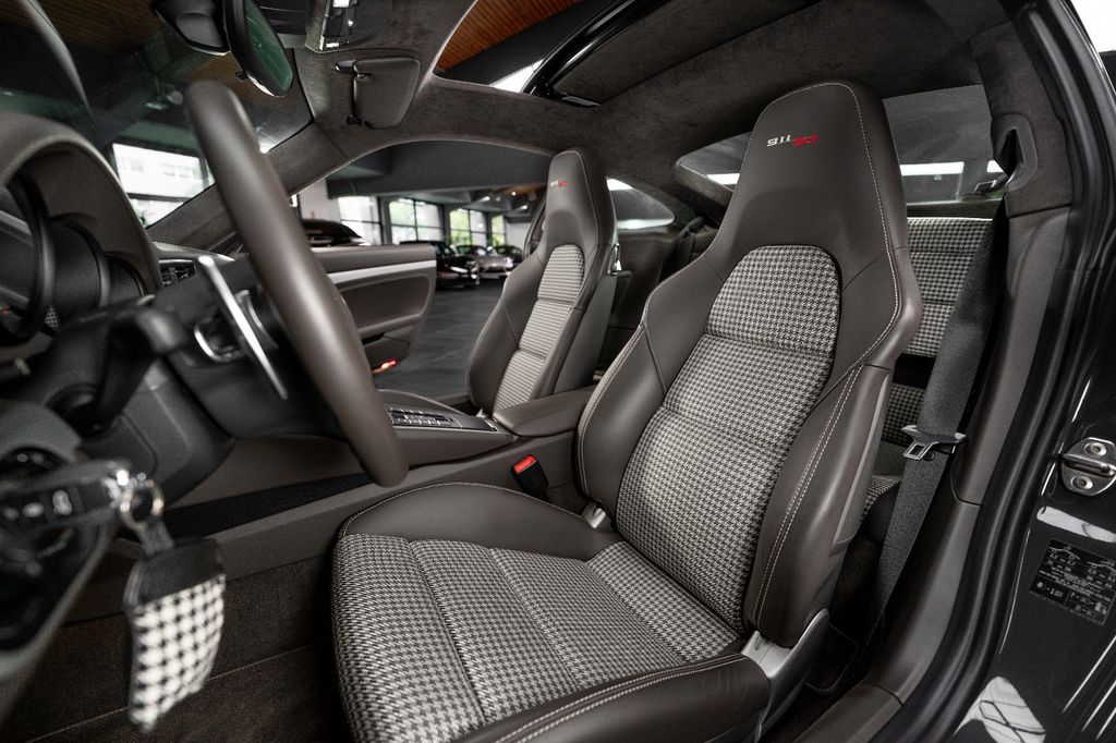 Innen: Leder-/Stoff Kombination mit klassischen "Pepita" Akzenten in achatgrau Stoff/Leder-Kombination mit "911 50" Einprägung an den Kopflehnen und heller Kontrastnaht; Lederbezogenes Cockpit-Armaturentafel und Türbrüstungen; Dachhimmel in Alcantara