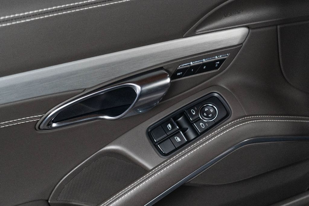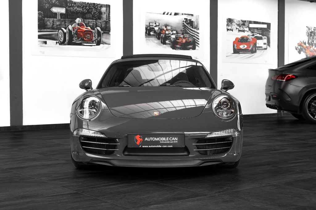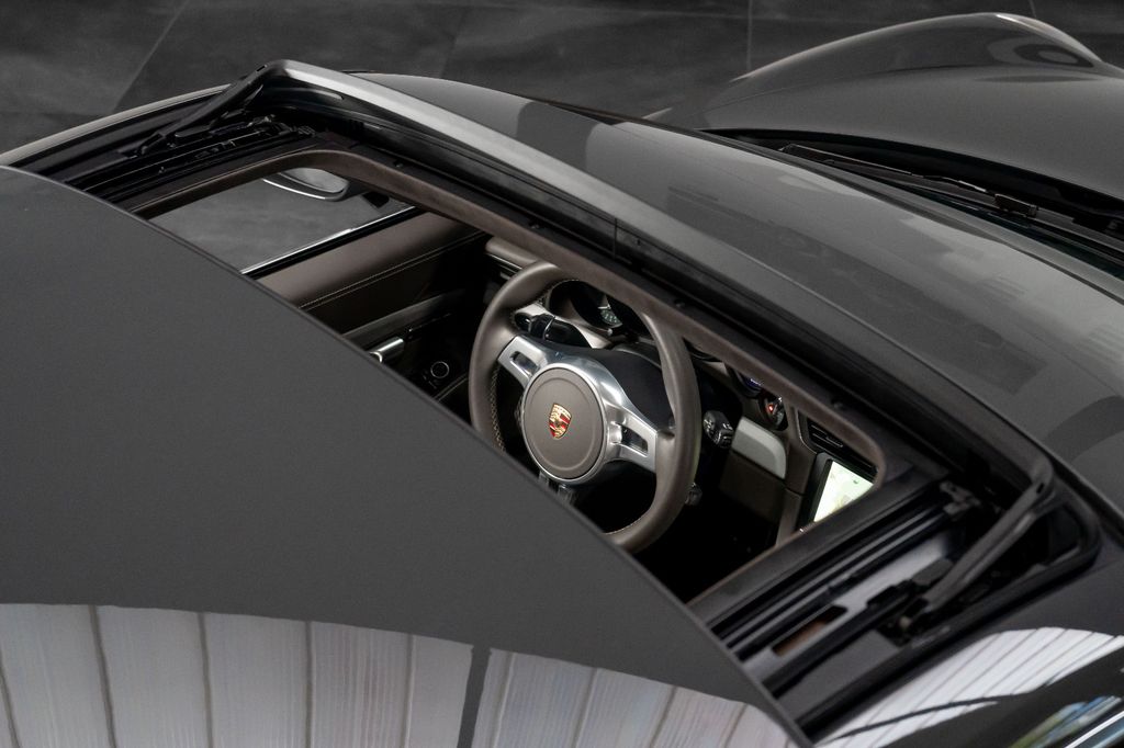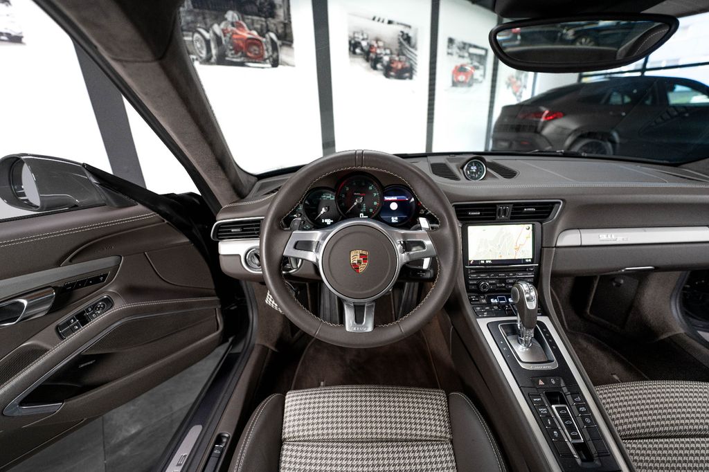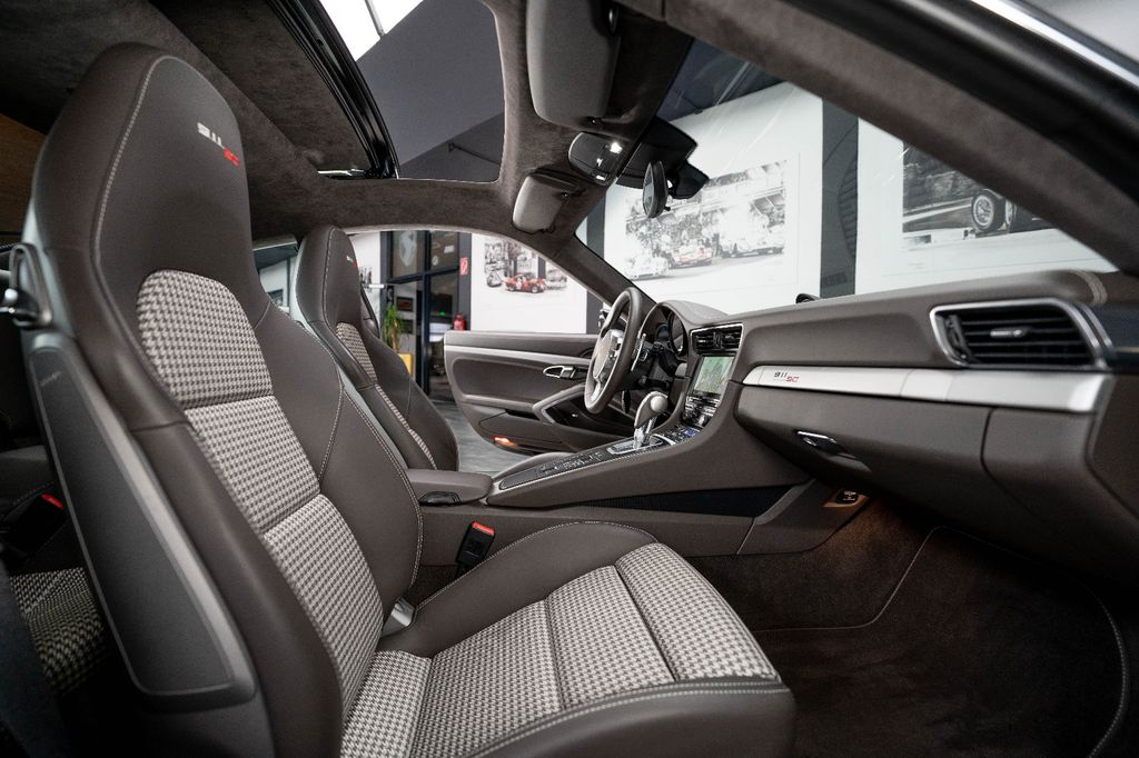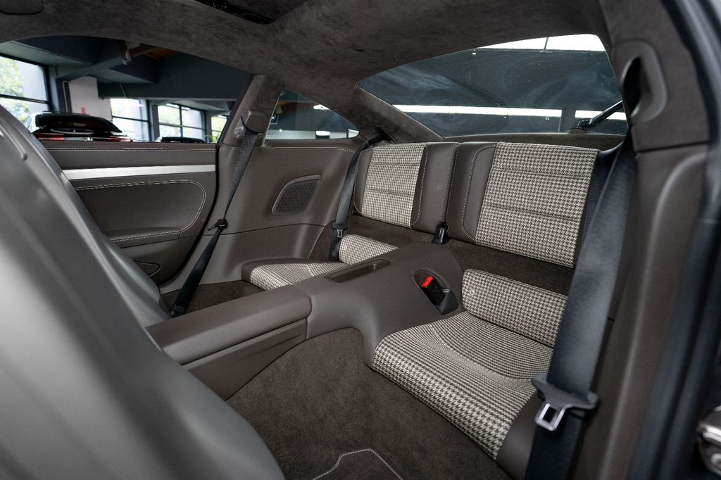 Innen: Leder-/Stoff Kombination mit klassischen "Pepita" Akzenten in achatgrau Stoff/Leder-Kombination mit "911 50" Einprägung an den Kopflehnen und heller Kontrastnaht; Lederbezogenes Cockpit-Armaturentafel und Türbrüstungen; Dachhimmel in Alcantara