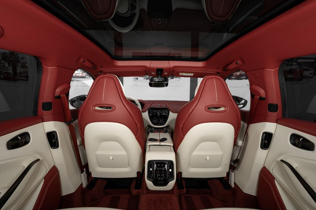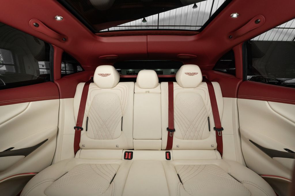 Innen: Cream Truffle Leder mit elegant perforierten Sitzeinsätzen und Gesticktes Aston Martin Wings-Logo; Cockpit-Armaturenoberfläche sowie Äußere Sitzfarbe in Chancellor Red; Dachhimmel in echt-Leder Chancellor Red